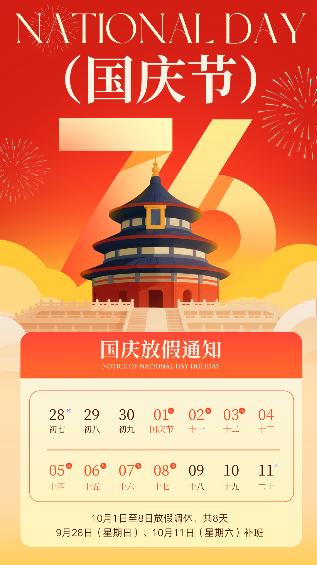 调休安排: 9月28日(星期日)和10月11日(星期六)照常上班